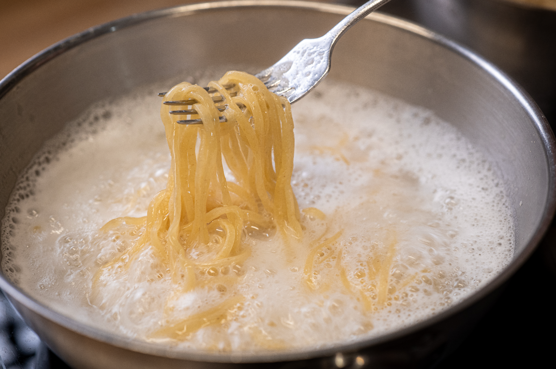Once it has reached a rolling boil, add the fresh spaghetti alla chitarra and set a timer for 2 minutes. Stir them every so often so they don’t stick!