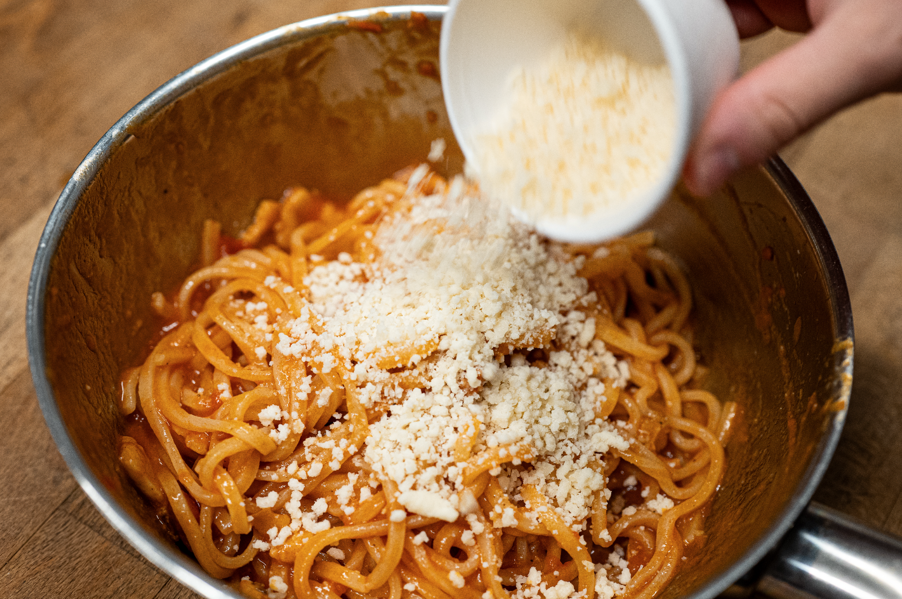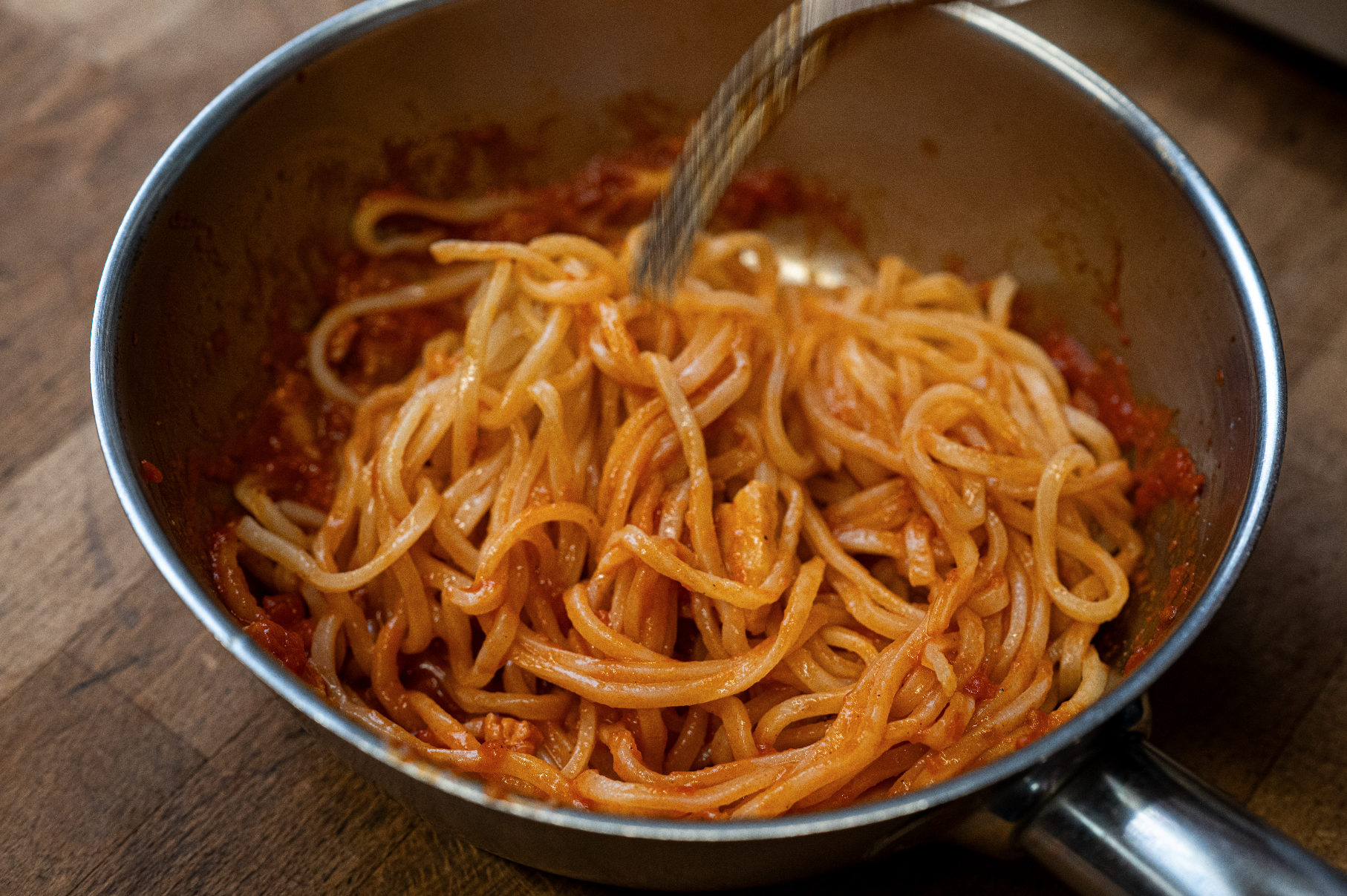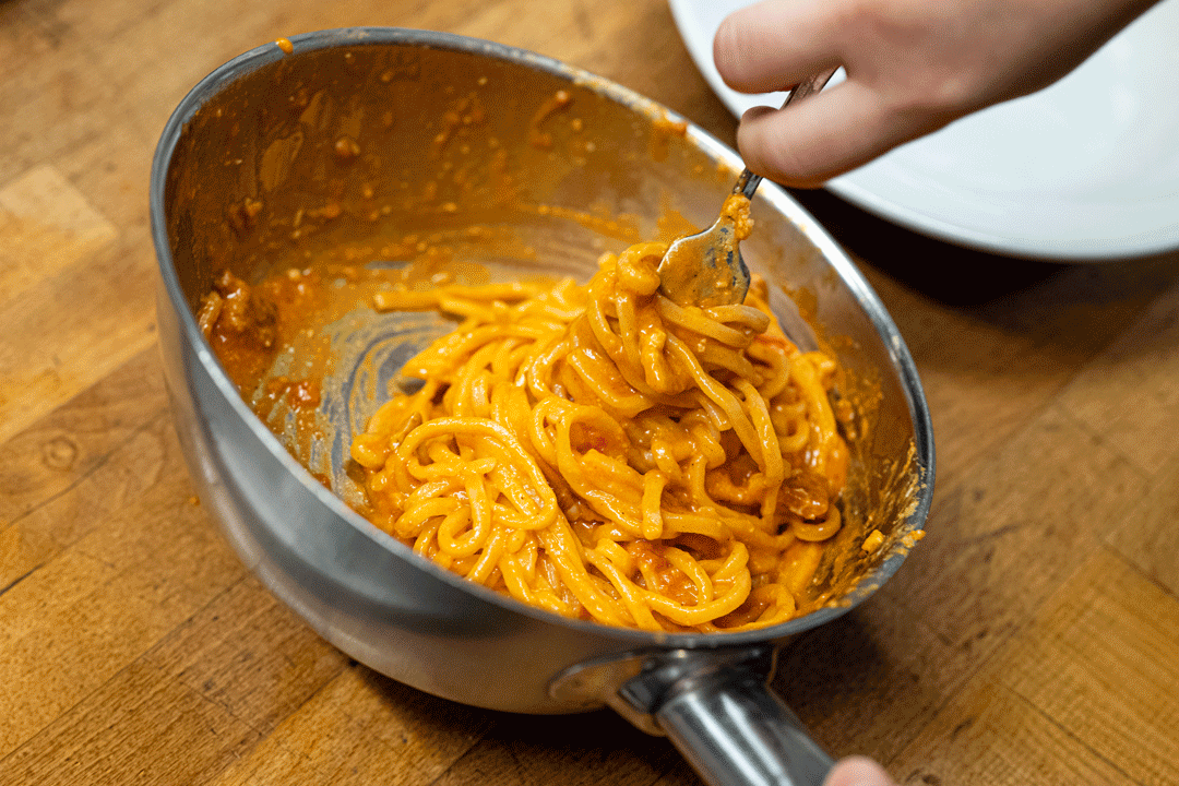 ONCE THE PASTA IS COOKED, ADD A SMALL AMOUNT OF THE COOKING WATER TO THE SAUCE, AND THEN STIR THE PASTA THROUGH IT.