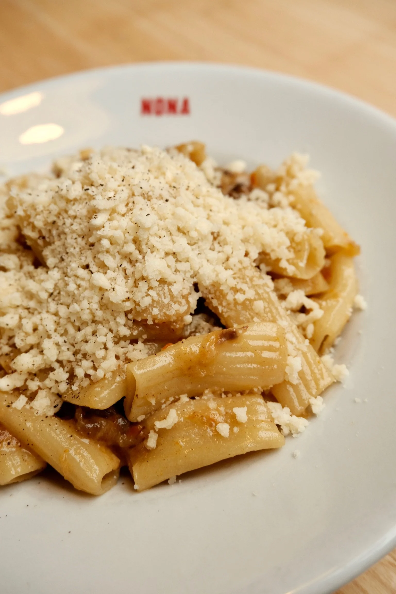 MACCHERONI with a white ragu of slow-cooked beef and onion, Pecorino Romano, and Parmigiano Reggiano