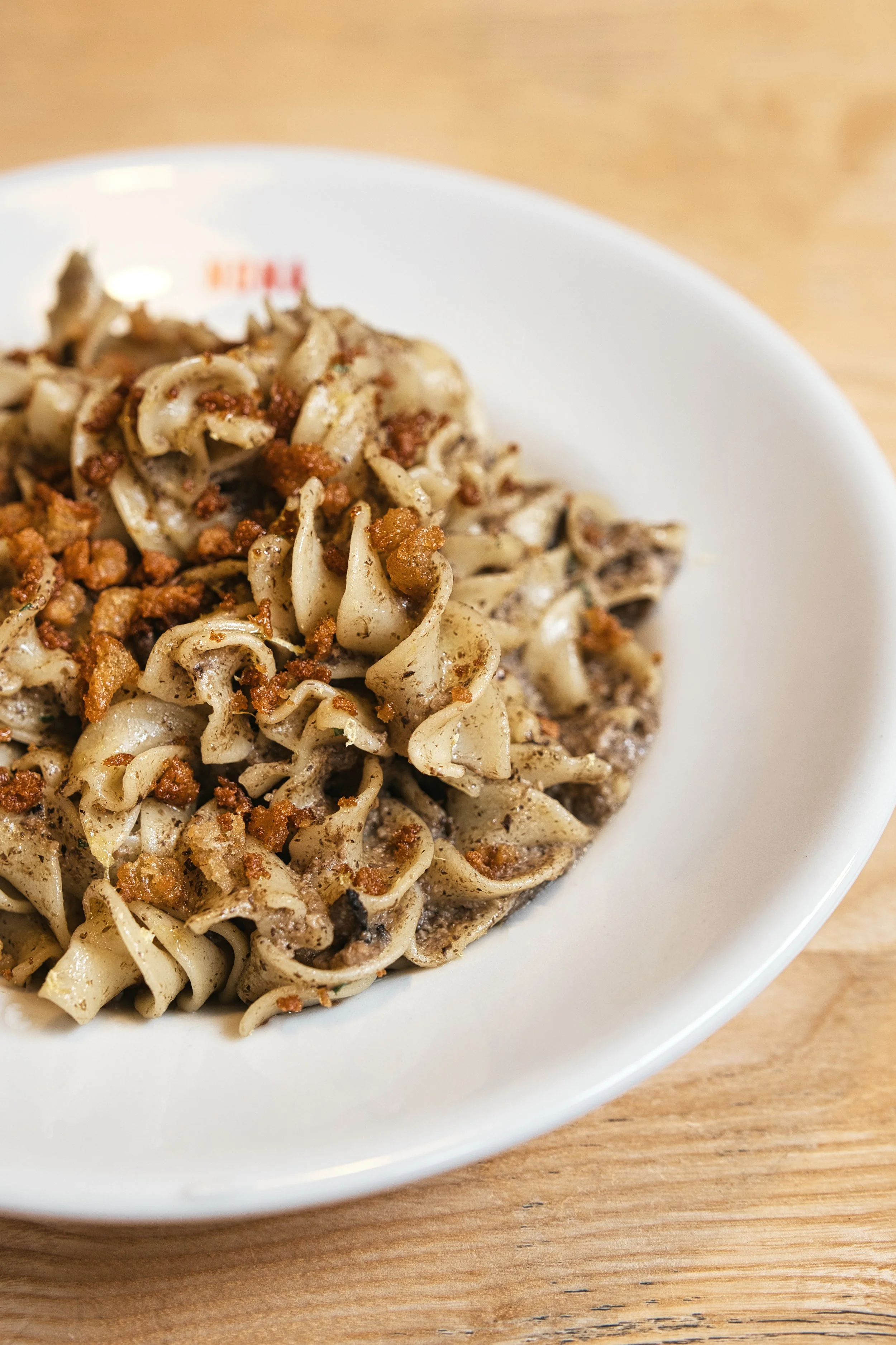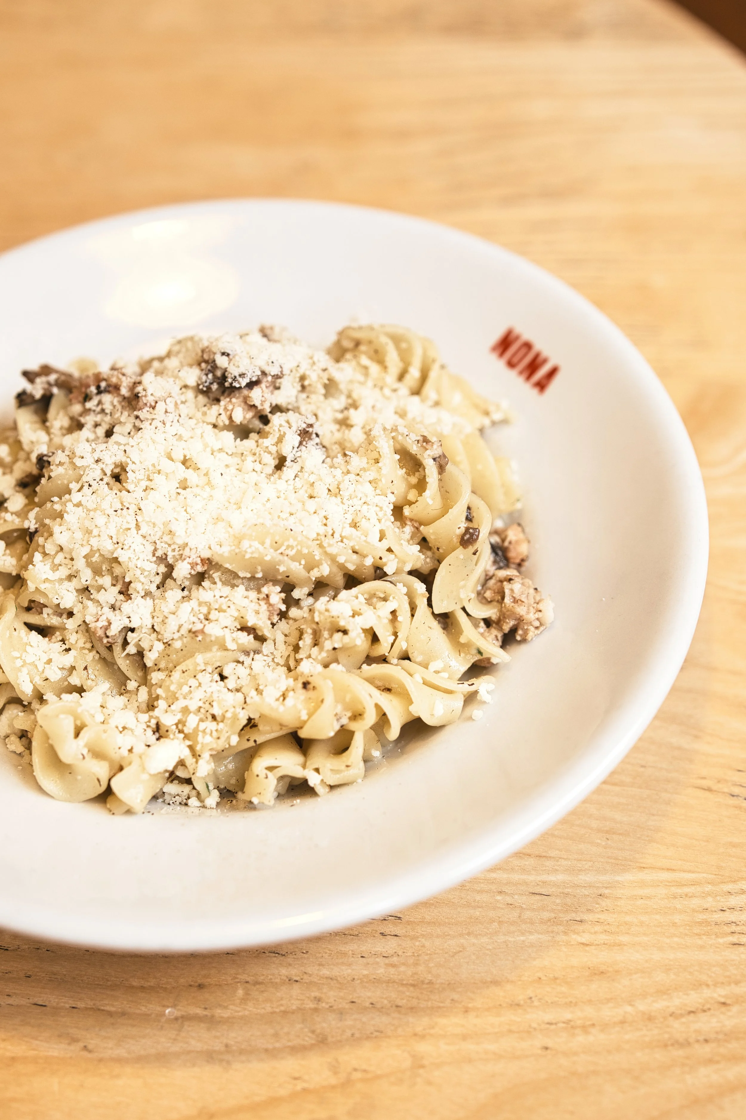 FUSILLONI with sautéed mushroom, sausage meat, Parmigiano Reggiano, and black truffle sauce