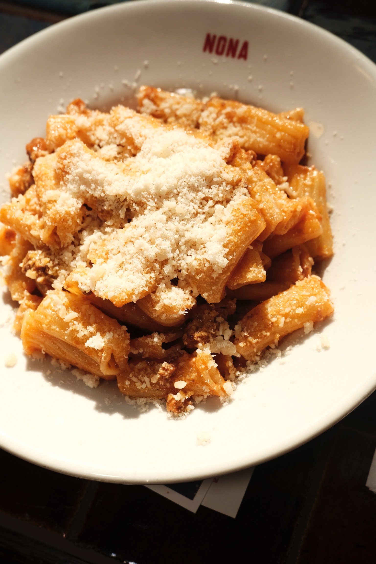 MACCHERONI with ragu of slow-cooked beef, celery, carrot, tomato, and Parmigiano Reggiano